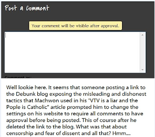 Machwon/Jim Jesus, decides to go on a self-righteous hissy fit because Kush's blog which is stock full of libel and lies was taken down by WordPress for a while for obvious violations of the Word Press terms of service. Why is this so ironic? Because he has zero problem whatsoever deleting comments from his own blog, and from Kush's blog. One of my readers posted a link to my blog exposing the lies he put in his blog accusing VTV of being a liar in the comments of that same blog. The comment was deleted, and then Mr. "I hate censorship" changed the settings on his blog so that he would have to approve any further comments. What are you scared of Mr. Machwon? Did it bother you that someone posted information that obviously proved your blog was full of lies and disinformation? You could of posted an answer to my allegations, but instead you censored it like a coward. And I know why, it's because you know my blog about your "VTV is a liar and the pope is catholic" blog crushed any semblance of credibility you had on the topic.